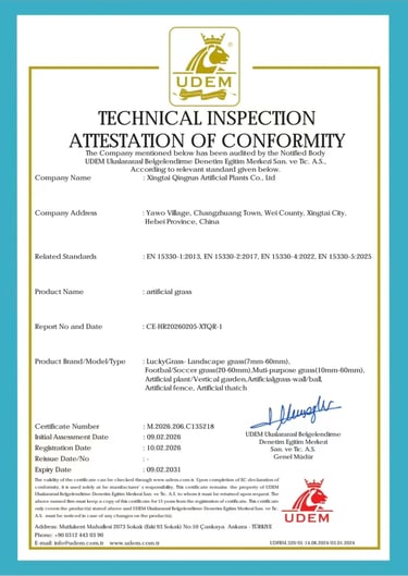 Today, our factory has formed a complete industrial chain production base, equipped with full-line production equipment and supporting component production lines for color masterbatch, anti-aging, fiber drawing, tufting, and backing adhesive. While strictly adhering to industry standards in production, the company also maintains cooperation with several authoritative certification bodies both domestically and internationally to ensure product quality and performance. Furthermore, we have successfully passed rigorous industrial standard testing covering all key parameters. Our synthetic turf has obtained certifications for excellent UV resistance, flame retardant properties, SVHC compliance, and excellent abrasion resistance, ensuring our products are safe, durable, and reliable in various applications.